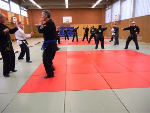 Diesmal gab es keine feuchten Keller, finstere Gestalten oder sonstige widrige Umstände zu überwinden, dennoch dürften viele Teilnehmer einige Überraschungen erlebt haben. Zum Beispiel die Erkenntnis, dass die verschiedenen ATK-Kata mehr gemeinsam haben, als es auf den ersten Blick scheint: Wie bei jeder Kata kommt es auch im ATK stets auf die drei Elemente Form (Technik), Anwendung und Einstellung an. Die innere Einstellung zum Kampf oder zum Stil, die richtige Selbsteinschätzung und vollkommene Konzentration sind für eine gelungene Messerkata schließlich genauso wichtig wie für die Atemkraftkata. Zum Lehren und Lernen der Techniken gab Claude ein paar Tipps, damit jeder die Formen künftig vorwärts und rückwärts, blind, spiegelverkehrt und im Schlaf beherrscht – und das meint Claude ernst! Wem das zu rigide ist, der lasse sich zum Nachdenken über die Inhalte der Kata einladen: Man sollte schon wissen, wie der vorgegebene Weg auszusehen hat, aber von dort aus bleibt immer Raum für eigene Interpretationen. Deshalb ist eine intensive Beschäftigung mit den Kata auch die beste Voraussetzung, um schließlich selbst freie Formen zu entwickeln, mit denen man in der nächsten Danprüfung Techniken, Anwendung und innere Einstellung vorbildlich unter Beweis stellen kann.